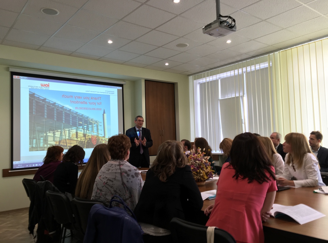На фото проф., д-р А. Хайнеманн (Університет м. Бремен, Німеччина) розповідає учасникам семінару про особливості функціонування моделі фіскального федералізму в Німеччині