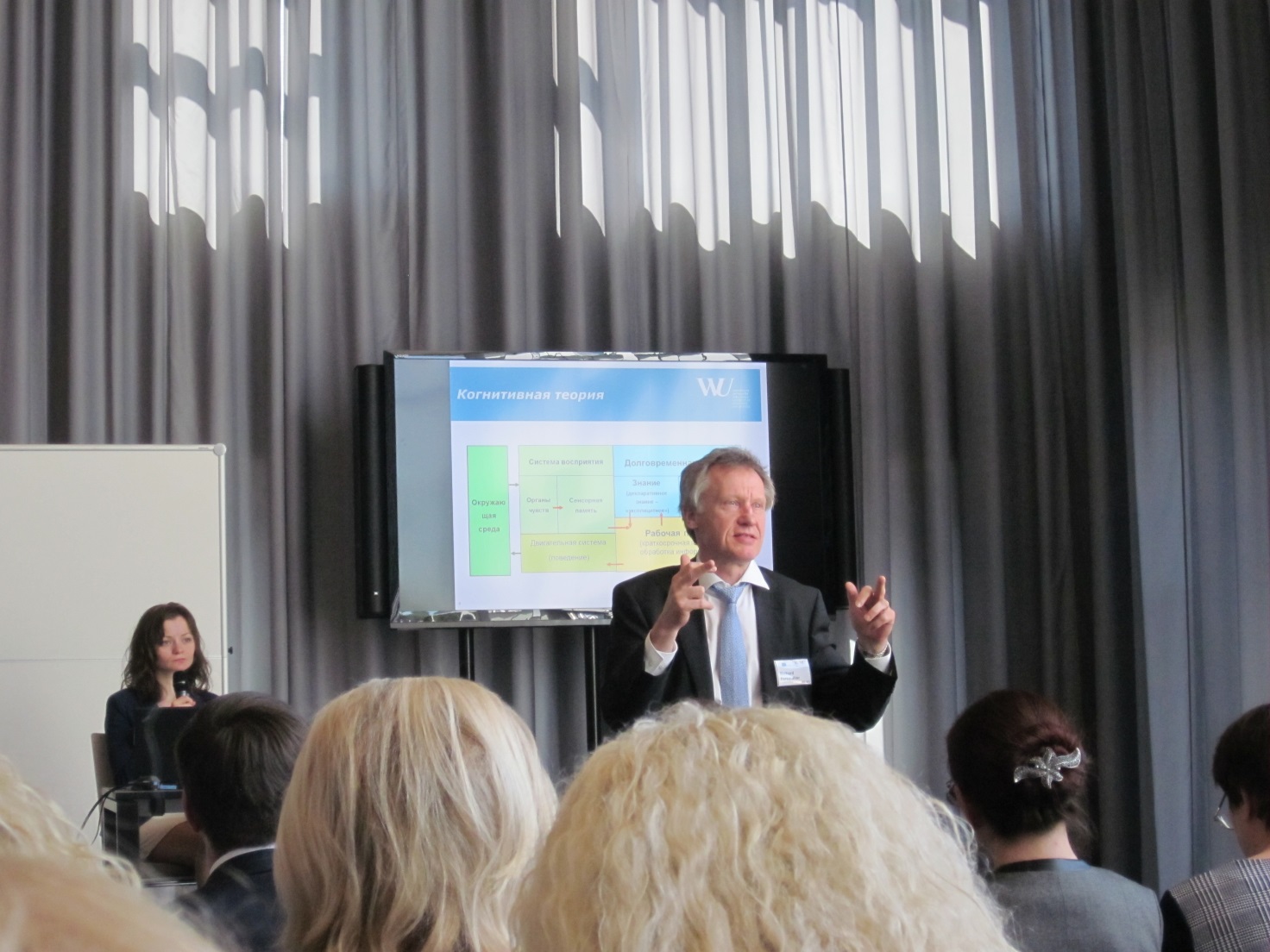 Розпочав зустріч керівник проекту проф. Ріхард Фортмюллер (Віденський університет економіки і бізнесу (Австрія)), який виступив із привітанням учасників, інформацією про стан реалізації проекту та доповіддю про набуття знань та формування компетенцій як основ головних цілей дидактики вищої школи.