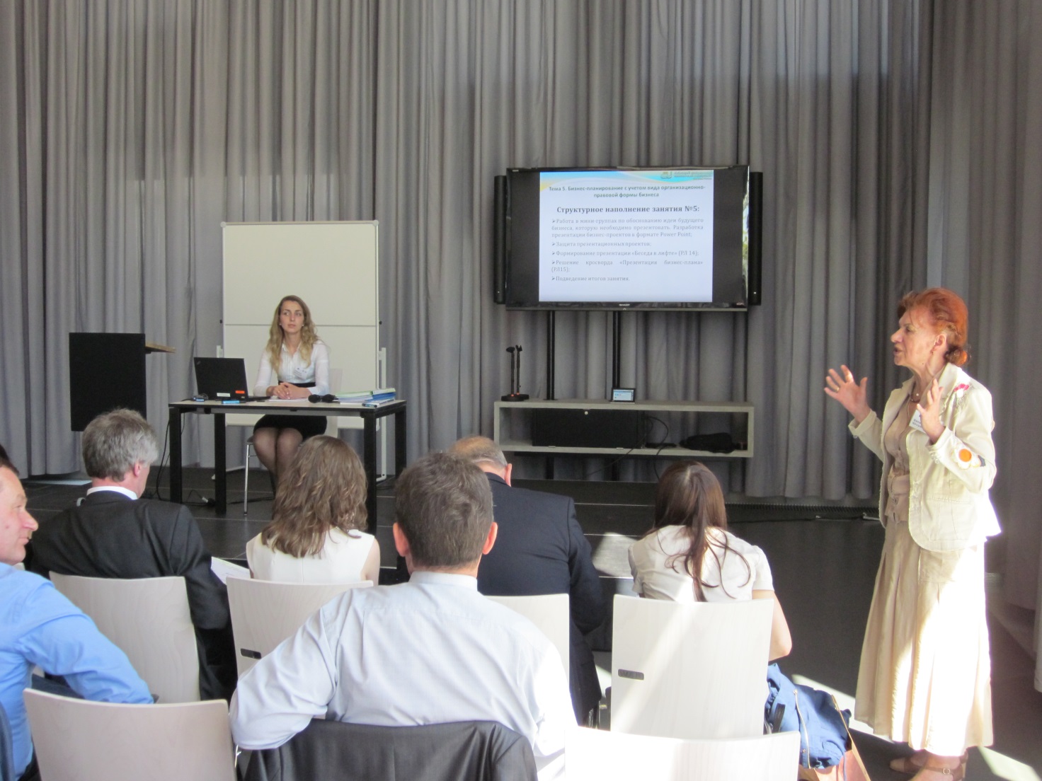 Професор Лазарєва С.Ф. презентувала тему «Кейс-стаді», директор економічного колледжу КНЕУ Марушевська В.І. тему «Логістика», директор колледжу інформаційних систем і технологій Грицак Н.Ю. тему «Організаційно-правові форми ведення бізнесу в Україні» та тему «Ліцензування і патентування підприємницької діяльності».