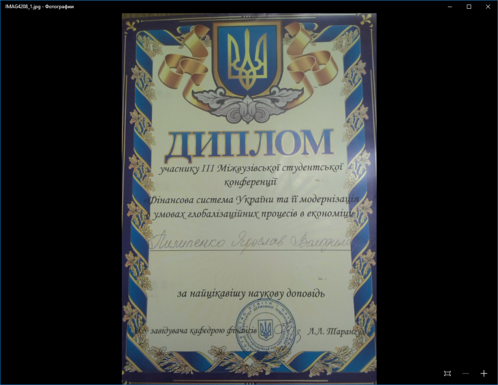 Доповідь Ярослава на тему «Податок на нерухоме майно: світовий досвід та реалії України» (науковий керівник к.е.н., доцент Сибірянська Ю.В.) викликала жваву дискусію серед слухачів та була визнана найкращою, за що Ярослава було нагороджено Дипломом та цінним подарунком.