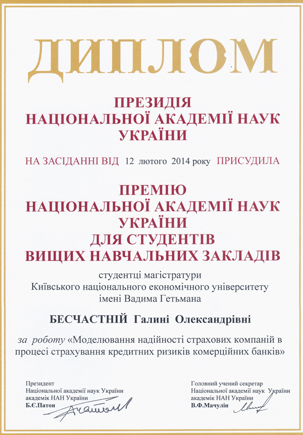 Студентка 5 курсу Факультету інформаційних систем і технологій Бесчастна Галина Олександрівна, що навчається за спеціальністю «Економічна кібернетика», стала переможцем конкурсу Національної академії наук України серед студентів вищих навчальних закладів та отримала Премію НАН України за роботу «Моделювання надійності страхових компаній в процесі страхування кредитних ризиків комерційних банків».