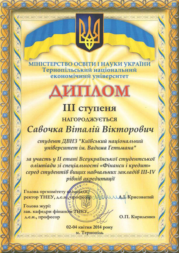 Професорсько-викладацький колектив кафедри фінансів КНЕУ вітає студента 2 групи ІV курсу фінансово-економічного факультету Савочку Віталія Вікторовича, із здобуттям диплома ІІІ ступеня у IІ етапі Всеукраїнської студентської олімпіади зі спеціальності «Фінанси і кредит».