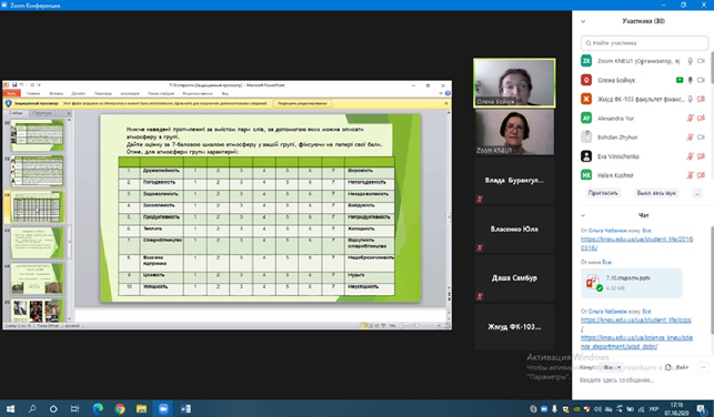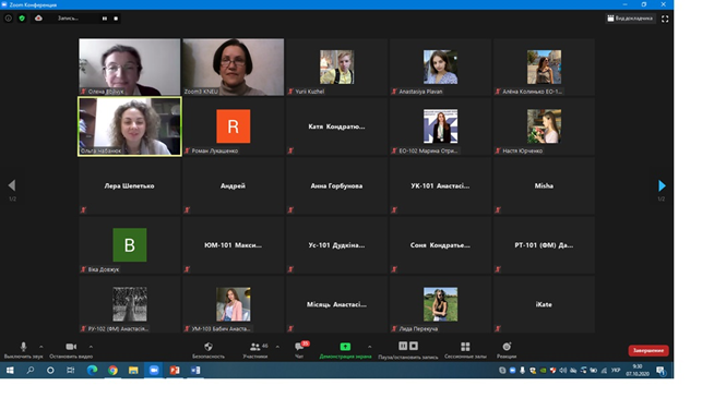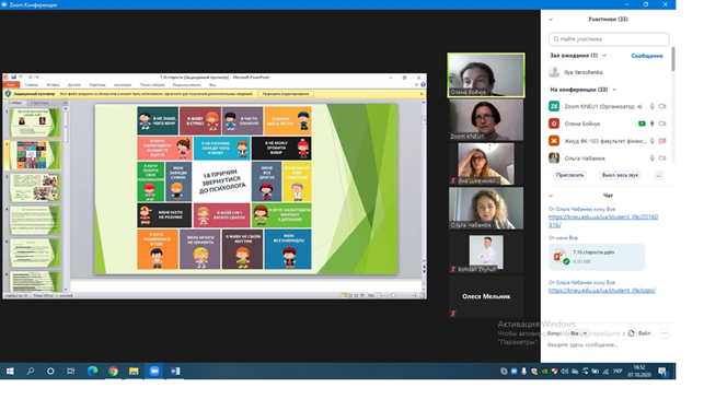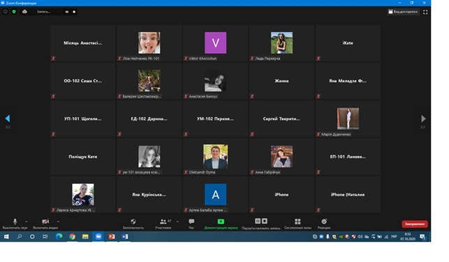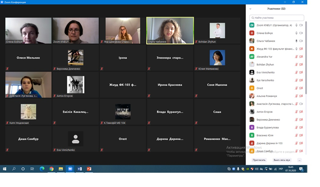 Наші справжні лідери!!! …про зустріч зі старостами 1-го курсу08 Жовтня 2020р.Відповідно до плану виховної роботи Університету 7 жовтня 2020 р. Центром виховної роботи та соціальної адаптації студентів спільно із Соціально-психологічної служби КНЕУ була проведена онлайн-зустріч зі старостами перших курсів з використанням платформи ZOOM. Головна мета заходу: сприяння швидкій адаптації першокурсників до університетського життя в особливих умовах тимчасових карантинних обмежень, розкриття особливої ролі старости в студентському колективі. З урахуванням розкладу навчального процесу зустріч мала дві ідентичні лінійки, у яких брали участь 85 старост всіх факультетів/інститутів Університету. Директор Центру виховної роботи та соціальної адаптації студентів Чабанюк Ольга Анатоліївна привітала представників академічних груп, в особі старост, налаштувала майбутніх лідерів на організаційну діяльність, розповіла про можливості та переваги активного студентського життя, ознайомила з напрямками діяльності Центру, який допомагатиме студентам у реалізації їх прав та захисті інтересів, співпрацюючи зі студентськими самоврядними та громадськими організаціями, Офісом Омбудсмена, Центром культури та мистецтв, спортивним комплексом та всіма структурними підрозділами Університету. «В умовах тривалої соціальної ізоляції, посилення пандемії Covid-19 зростає потреба у наданні постійної психологічної та соціально-педагогічної підтримки всім учасникам освітнього процесу, системної просвітницької та профілактичної діяльності із збереження психічного здоров’я студентів», - зазначила О.А. Чабанюк та наголосила на важливості роботи Соціально-психологічної служби в Університеті. Психологи Соціально-психологічної служби Бойчук Олена Сергіївна та Корват Лариса Володимирівна розкрили питання про права і обов’язки старости, про врахування типології сучасних студентів у ефективній взаємодії з одногрупниками, про особливості формування сприятливого соціально-психологічного клімату в академічній групі, поінформували, з яких питань і в яких випадках варто звертатися до психолога. Під час зустрічі зі старостами проведено тест на визначення рівня прояву лідерських якостей; до виконання старостам була запропонована експрес-методика діагностики соціально-психологічного клімату групи, яка допоможе їм працювати над згуртуванням групи в подальшому. Були сформульовані завдання старост щодо особливої уваги до студентів, які належать до різних груп ризиків і проявляють особливості дезадаптації, та надані рекомендації старостам спрямовувати їх до психологів Соціально-психологічної служби! … це тільки початок плідної роботи!!!