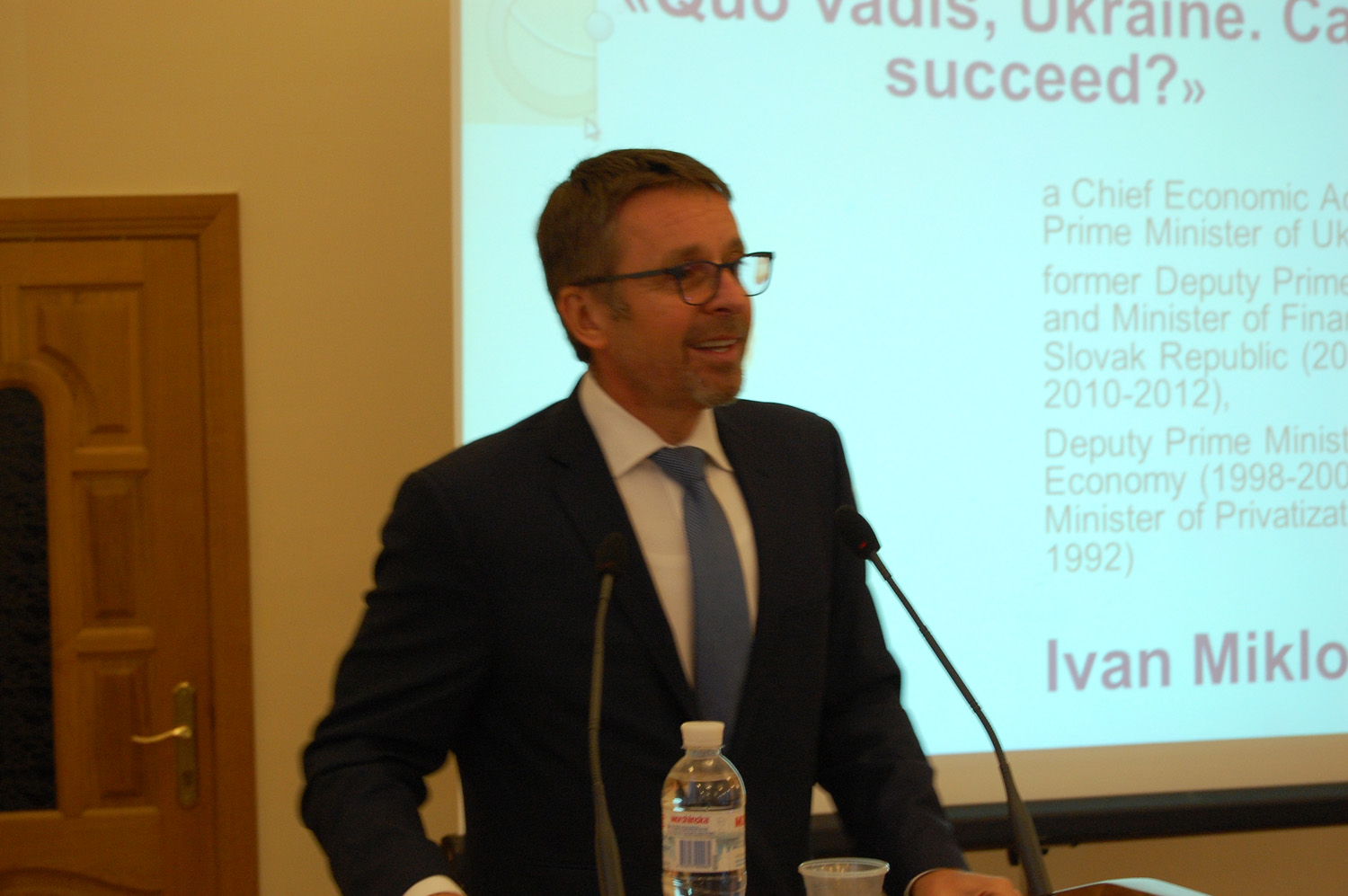 Іван МІКЛОШ – архітектор успішних системних реформ Словаччини, заступник прем’єр-міністра і міністр фінансів Словацької Республіки (2002-2006, 2010-2012), заступник прем'єр-міністра з питань економіки (1998-2002), і міністр з приватизації (1991-1992) - виступив з лекцією на тему: "Quovadis, Ukraine.Canitsucceed?”, зосередивши увагу на програмах, які в Україні вже вдалося реалізувати в рамках реформаторських заходів, розказав які перспективи чекають на Україну в разі успішного провадження реформ та який досвід може бути використаний для трансформації, щоб населення країни відчуло зміни в державному секторі.