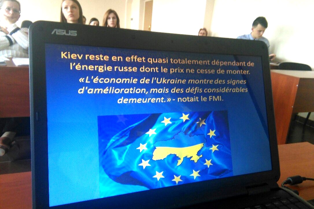 - Бабінський Богдан - студент 4 курсу факультету мiжнародної економiки iменеджменту – презентував аналітичну інформацію за даними sputniknews «L'économie de l'Ukraine dans une situation critique»