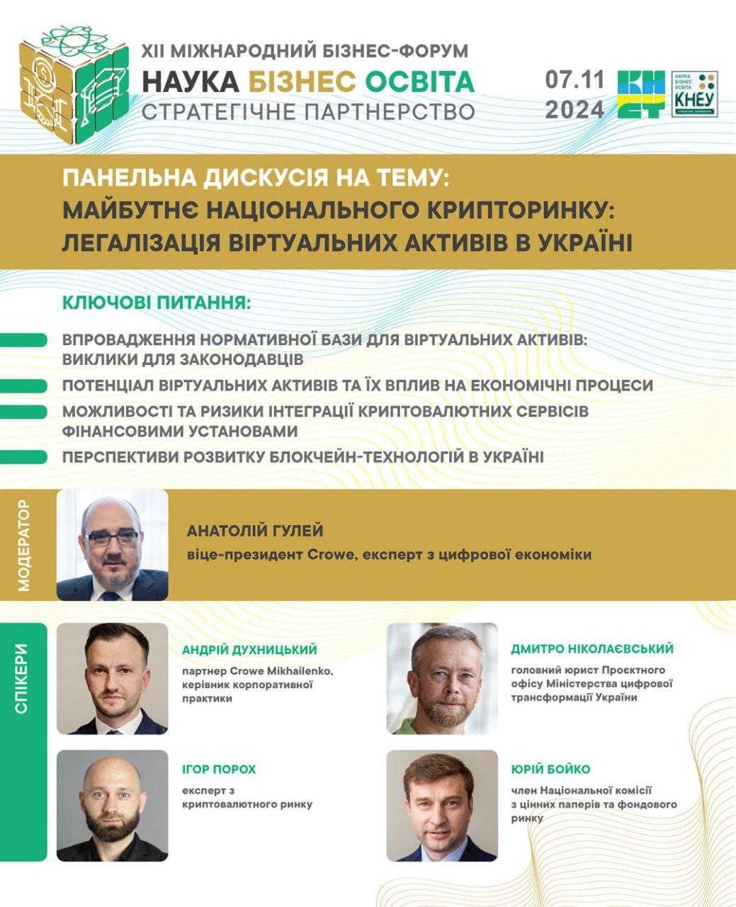 7 листопада 2024 року в в рамках XIIIМіжнародного Бізнес-Форуму «Наука – бізнес – освіта: стратегічне партнерство»відбулась дискусійна панель, присвячена ключовим питанням розвитку ринку віртуальних активів в Україні. Основна тема обговорення — легалізація та регулювання крипторинку, що стає дедалі актуальнішим на тлі глобального розширення сфери віртуальних активів.Серед головних питань панелі — розробка та впровадження нормативної бази для віртуальних активів. Експерти розглянули виклики, з якими стикаються законодавці, та потенційні шляхи їх подолання. Також було проаналізовано економічний потенціал криптовалют і їх вплив на макроекономічні процеси України.Учасники обговорили роль державних регуляторів у створенні безпечного середовища для інвесторів та користувачів, а також ризики й можливості інтеграції криптовалютних сервісів у фінансово-банківський сектор. Окрему увагу було приділено перспективам розвитку блокчейн-технологій у державному секторі.Ця панельза останні роки сталаінтелектуальним майданчиком для обміну думками між представниками влади, бізнесу та експертами галузі з метою визначення шляхів подальшого розвитку ринку криптовалют в Україні.