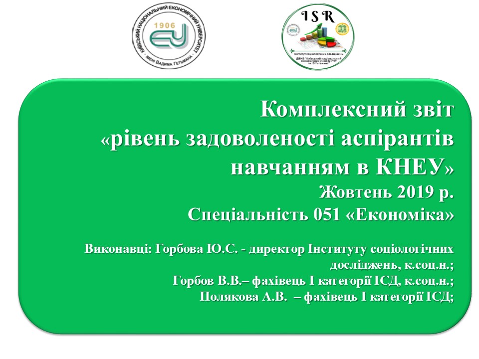 Дослідження: «Рівень задоволеності аспірантів навчанням в КНЕУ».06 Листопада 2019р.![]() 6.11.2019 Форма роботи:проведення соціологічного дослідження Замовник: Гарант ОНП 051 «Економіка», PhD, професор, д.е.н., Лігоненко Л.О. Тематика Дослідження:«Рівень задоволеності аспірантів навчанням в КНЕУ». Стислий зміст:на звернення Гарант ОНП 051 «Економіка», PhD, професор, д.е.н., Лігоненко Л.О. співробітниками Інституту соціологічних досліджень було проведено соціологічне дослідження «Рівень задоволеності аспірантів навчанням в КНЕУ». Основною метою проведення дослідження було визначення задоволеності ОНП та визначення шляхів подальшого розвитку та удосконалення освітніх компонент.Дослідження було проводено з 7 жовтня по 1 листопада 2019 року на умовах повної анонімності.Розповсюдження інформації про опитування було розповсюджено через кафедри, за якими закріплено аспірантів відповідної спеціальності, та відділ аспірантури. Посилання на опитування: https://forms.gle/kiUedCWiXscpzu9b7.Респонденти могли заповнити анкету онлайн індивідуально у будь-який зручний для них час, відзначаючи відповідним чином обраний ними варіант відповіді.