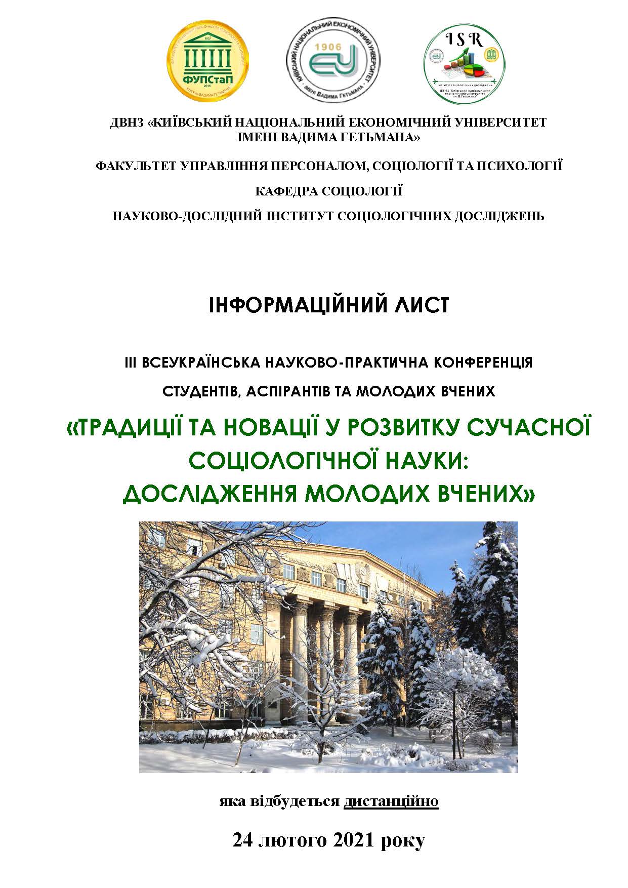 Кафедра соціології та науково-дослідний інститут соціологічних досліджень Державного вищого навчального закладу «Київський національний економічний університет імені Вадима Гетьмана» щиро запрошує взяти участь у IІІ Всеукраїнській науково-практичній конференції студентів, аспірантів та молодих вчених «Традиції та новації у розвитку сучасної соціологічної науки: дослідження молодих вчених».