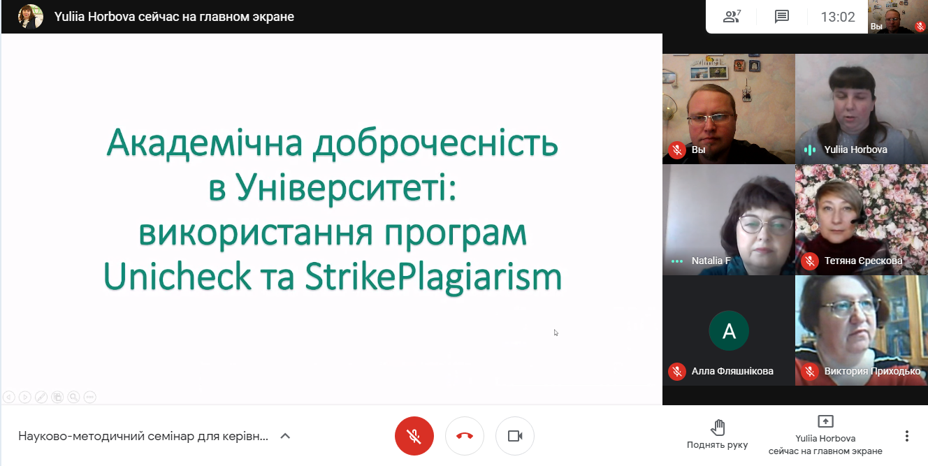 Горбова Ю.С. провела науково-методичний семінар для керівників дипломних робіт здобувачів вищої освіти першого (бакалаврського) рівня на тему «Академічна доброчесність в Університеті: використання програм Unicheck та StrikePlagiarism».