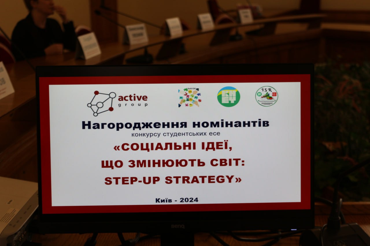 - Підведення підсумків та нагородження номінантів конкурсу студентських есе «Соціальні ідеї, що змінюють світ: step-up strategy»