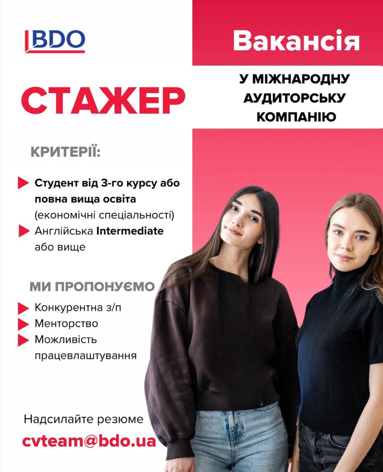📩  Резюме надсилайте на електронну адресу: cvteam@bdo.ua