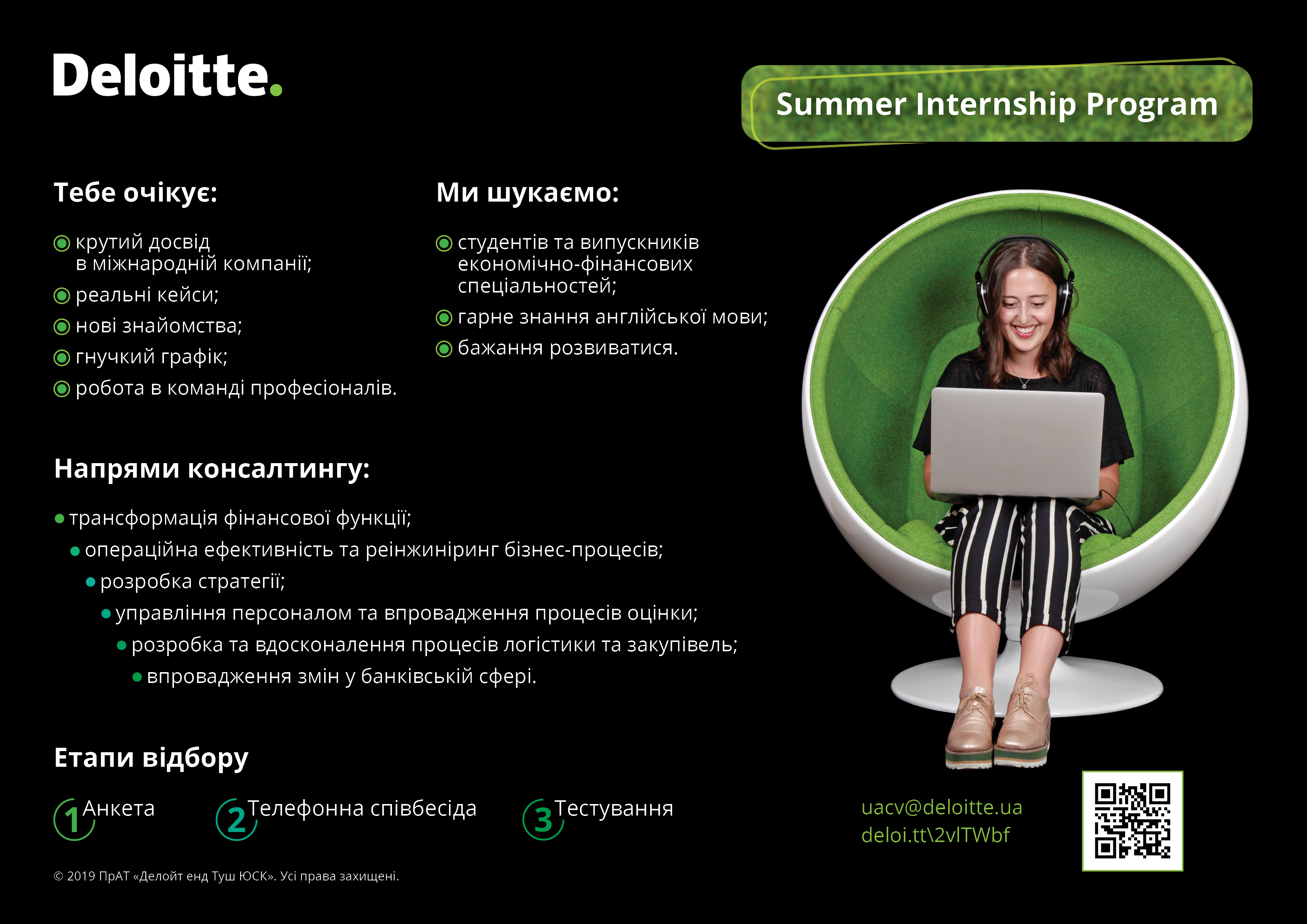 Мрієш отримати безцінний досвідта розвинути професійні навичкиу компанії мрії? Deloitte оголошуємо набірна літнє стажуванняу департамент Консалтингу!