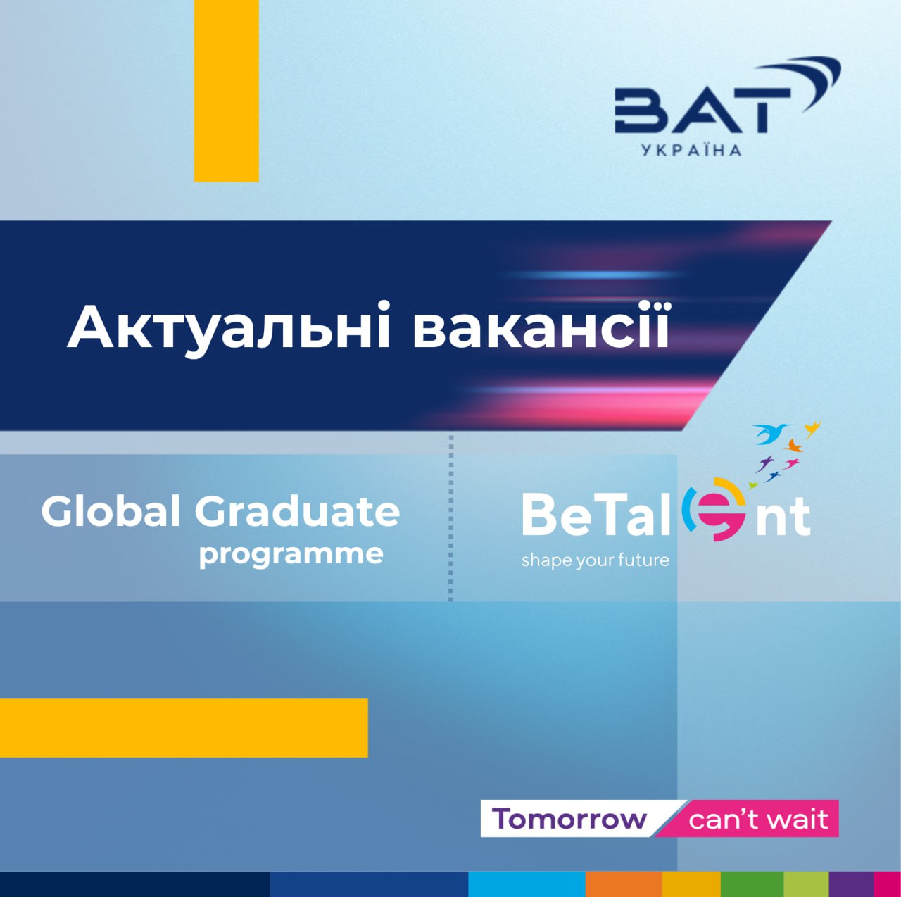 Добірка вакансій у BAT Україна07 Листопада 2025р.![]() #вакансії_перспектива 📢 Запрошуємо студентів 4–6 курсів та нещодавніх випускників до команди BAT Україна! 🏢 BAT Україна – частина глобальної групи BAT в тютюновій галузі, яка створює можливості для молоді, що прагне професійного розвитку вже під час навчання. 💼 Добірка вакансій у BAT Україна: 👉 BeTalent Sales (3 місяці) 👉 BeTalent (6–9 місяців) 👉 Global Graduate (18 місяців) Ми пропонуємо: 🔹 Оплачувані стажування з гібридним графіком 🔹 Міжнародне середовище та досвід 🔹 Навчання та розвиток 🔹 Програми добробуту та компенсацію харчування 🔹 Можливість кар’єри в BAT після стажування 🔗 Детальніше про кар'єрні можливості BAT тут. 📩 Питання? Пиши BAT Україна у соцмережах або на сайті! |