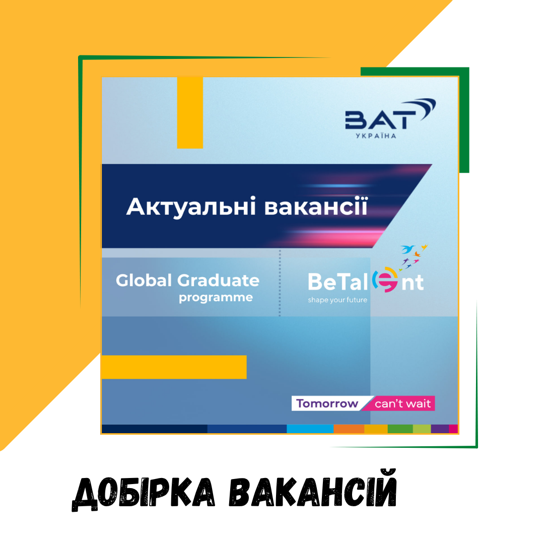 Добірка вакансій у BAT03 Жовтня 2025р.![]() #вакансії_перспектива 📢 Запрошуємо студентів 4–6 курсів та нещодавніх випускників до команди BAT Україна! 🏢 BAT Україна – частина глобальної групи BAT в тютюновій галузі, яка створює можливості для молоді, що прагне професійного розвитку вже під час навчання. Добірка вакансій у BAT: 👉 BeTalent Sales (3 місяці) 📍 Одеса Sales Intern (торговий маркетинг) – практика у сфері продажів, підтримка польових команд, можливість перейти на роль торговельного представника. 👉 BeTalent (6–9 місяців) 📍 Прилуки Інтерн у відділ постачання – оптимізація логістики, аналітика, діджиталізація звітності. 📍 Прилуки Інтерн на виробництві – аналіз ефективності обладнання, автоматизація процесів, покращення виробничих звітів. 👉 Global Graduate (18 місяців) 📍 Київ Finance – корпоративні, операційні та комерційні фінанси, автоматизація процесів. Marketing – запуск нових продуктів, B2B-програми, планування та аналітика. 📍 Прилуки Operations – виробництво, інженерія, постачання, якість. Ми пропонуємо: 🔹 Оплачувані стажування з гібридним графіком 🔹 Міжнародне середовище та досвід 🔹 Навчання та розвиток 🔹 Програми добробуту та компенсацію харчування 🔹 Можливість кар’єри в BAT після стажування 🔗 Детальніше про кар'єрні можливості BAT тут 📧 Питання? Пиши BAT Україна у соцмережах або на сайті! |