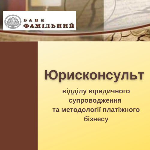 Команда ПрАТ «БАНК ФАМІЛЬНИЙ» і ВПС «FLASHPAY» запрошує до себе юрисконсульта відділу юридичного супроводження та методології платіжного бізнесу