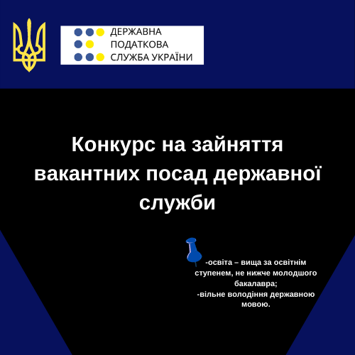 ДПС04 Червня 2021р.![]() #вакансії_перспектива В Інформаційно-довідковому департаменті ДПС оголошено конкурс на зайняття вакантних посад державної служби. Детальна інформація щодо оголошеного Інформаційно-довідковим департаментом ДПС конкурсу на вакантні посади розміщена на Єдиному порталі вакансій державної служби https://career.gov.ua/ Вимоги до компетентності: -освіта – вища за освітнім ступенем, не нижче молодшого бакалавра, бакалавра фінансово-економічного чи юридичного спрямування; -вільне володіння державною мовою. Телефон відділу кадрового забезпечення та розвитку персоналу ІДД ДПС 044-284-09-77, 044-284-09-79, адреса електронної пошти: iddkadry@gmail.com. Чекаємо перспективних студентів та молодих спеціалістів! |