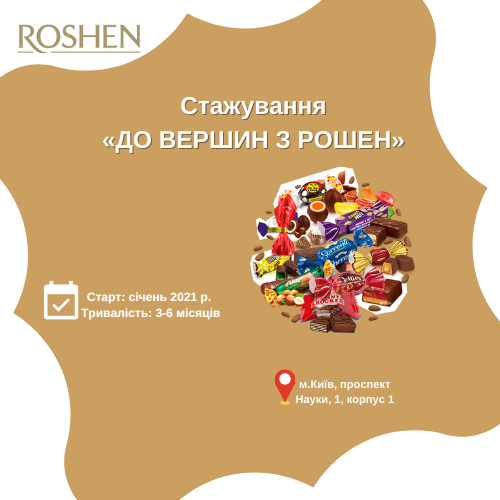 Кондитерська Корпорація РОШЕН запрошує студентів 4-6 курсів та випускників 2019-2021 років вищих навчальних закладів України до оплачуваного стажування «ДО ВЕРШИН З РОШЕН» за напрямом «Фінанси».