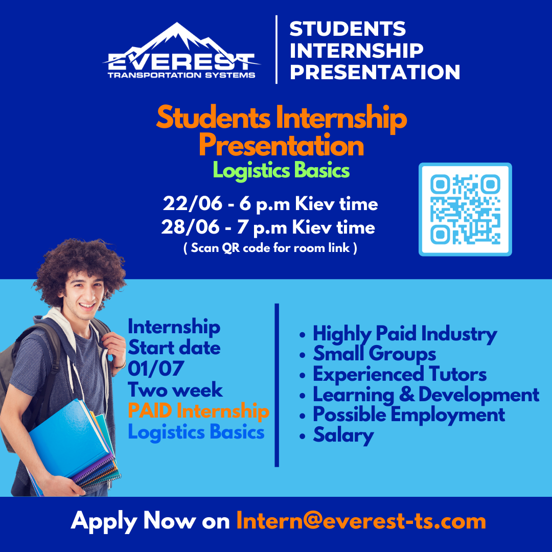 Everest18 Червня 2021р.![]() #стажування_перспектива Hello! We are Everest Transportation System. We work in the field of Logistics in the American market, which is one of the top 10 largest industries in the Ukrainian labor market, where the sky is the limit. Internship - Two weeks - Paid - Small Group Format - Practical Theory Application - Experienced Lecturers Strong Fit For : -Graduate Students -Young Professionals After the Internship: - Certificate of Course Completion - Experience in US Company - Networking Within the Company - Career Growth Potential - Payment for the Internship (pending successful completion of the internship and a job offer) How to apply for internship: • Send your resume to Intern@everestts.com • For more information call or text +380665122804 • Take part in our online meeting https://everestts.whereby.com/internship We have been growing exponentially in the last couple of years and are looking for young talented professionals join our team and climb with us! Students Internship Presentation - Online meeting (with Vice President of Sales - Lev Krasnopolskiy) 22/06 - 6 p.m Kiev time 28/06 - 7 p.m Kiev time |