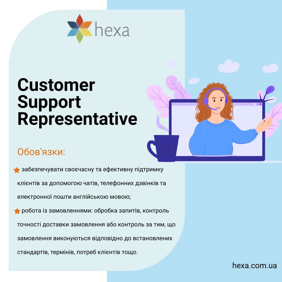 IT компанія Хекса знаходиться в пошуку кандидата на позицію Customer Support Representative без попереднього досвіду роботи