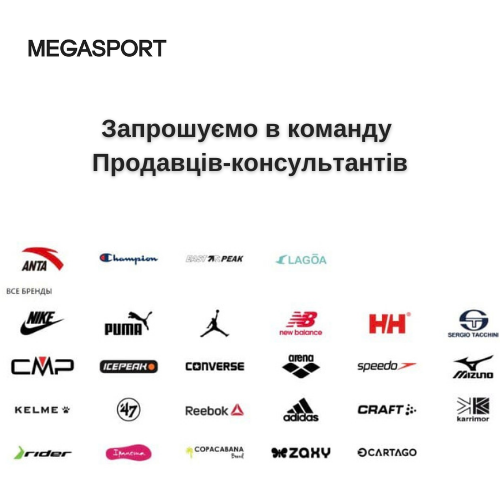 ТМ MEGASPORT — національна мережа мультибрендових магазинів з продажу спортивного одягу та взуття провідних світових виробників NIKE,PUMA,NEWBALANCE,ANTA,ICEPEAK,CONVERS,LAGOA, та інші. запрошує в команду Продавців-консультантів.