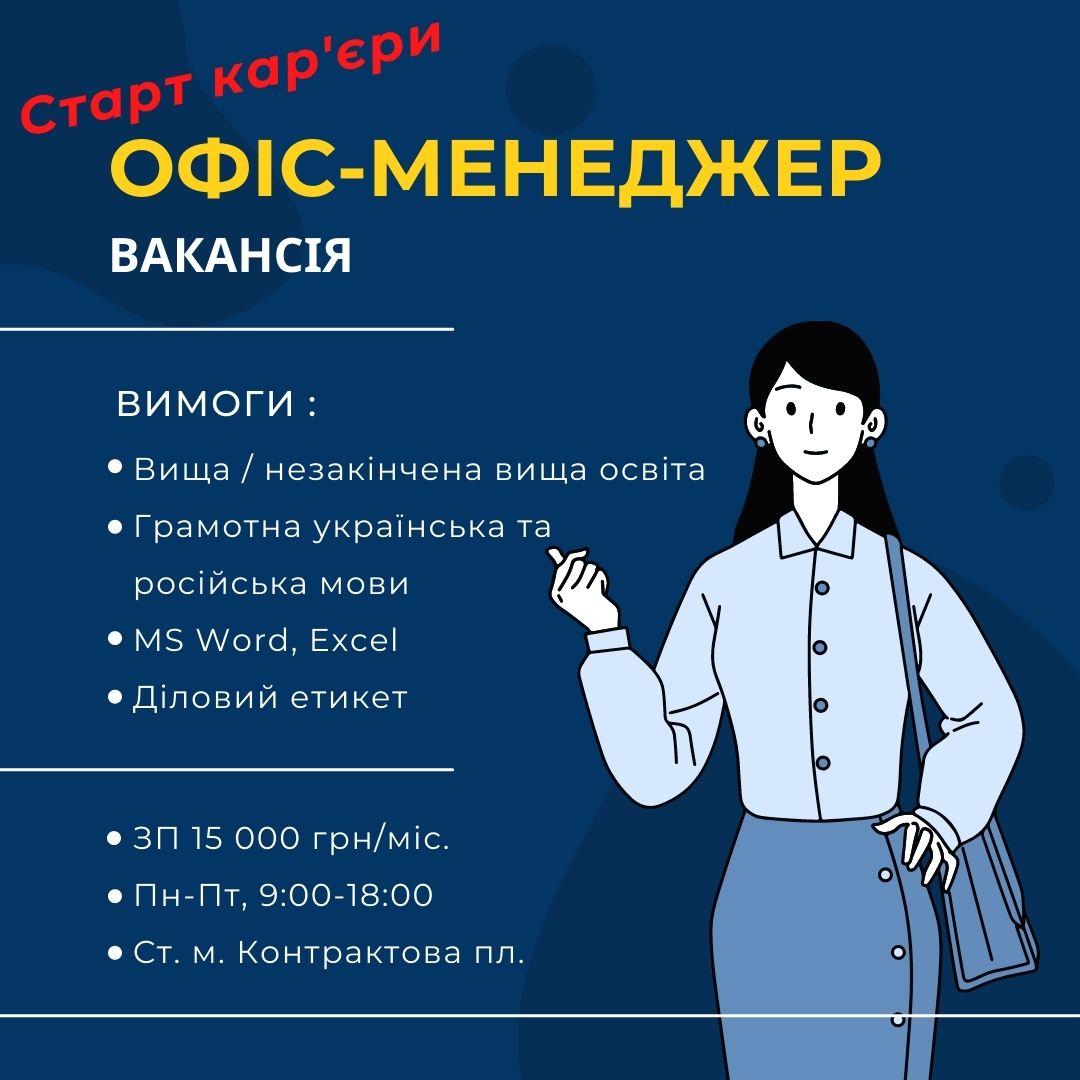 Компанія з багаторічним досвідом роботи на ринку професійних бізнес-послуг, високою репутацією та розвинутою корпоративною культурою, запрошує до своєї команди інтелігентного та відповідального Офіс-менеджера.