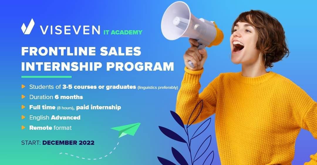 Frontline Sales Internship Program16 Листопада 2022р.![]() #стажування_перспектива We are excited to announce that Viseven has launched a Frontline Sales Internship Program It is a great opportunity to become an Assistant Sales Development Representative. What’s in it for you? Opportunity to work with world pharmaceutical companies and get involved in the real projects Get first-hand experience from Sales Management mentors 180 EUR/per month scholarship in case of successful study Job offer after internship by the results of interview, stable career, and earning plan set for the first year of cooperation For whom? Students of 3-5 courses or graduates (linguistics preferably) Those who want to get into the IT industry Required English level – Advanced Duration: 6 months Start Date: December 2022 Format: Remote Full time (8 hours) Please, use the link to apply & discover more details: https://jobs.lever.co/…/5c5e232d-c841-4263-a489-b27730fbe69… |