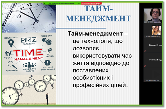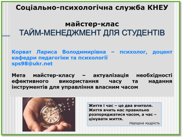 Інформація про Майстер-клас «Тайм-менеджмент для студентів»21 Листопада 2020р.20 листопада 2020 було успішно проведено онлайн майстер-клас «Тайм-менеджмент для студентів», підготовлений Соціально-психологічною службою КНЕУ з метою сприяння адаптації до навчання у виші студентами-першокурсниками. Метою майстер-класу була актуалізація необхідності ефективного використання часу та надання інструментів для управління власним часом. Майстер-клас було проведено психологом Соціально-психологічної служби КНЕУ, доцентом кафедри педагогіки та психології Корват Ларисою Володимирівною. Студенти мали змогу переконатися у важливості управління власним часом для досягнення поставлених цілей, для перебування у балансі між навчанням, роботою, відпочинком, дозвіллям, хобі. Було надано окремі інструменти тайм-менеджменту, за допомогою яких, можна раціонально організовувати власну життєдіяльність. Сподіваємось, що одна із представлених метафор майстер-класу, що час летить, але кожен є пілотом свого часу, знайшла відгук в серцях учасників та активізувала мотивацію успіху на шляху професійного та особистісного становлення.