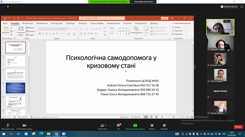 7 квітня 2022 в рамках психологічної допомоги викладачам та студентам психологом ЦСАПД КНЕУ Бойчук Оленою Сергіївною було проведено тренінгове заняття на тему «Психологічна самодопомога у кризовій ситуації». Учасники заходу мали можливість набути умінь самодопомоги у кризовій ситуації, що важливо для попередження емоційного вигоряння та ПТСР в умовах воєнного стану.
