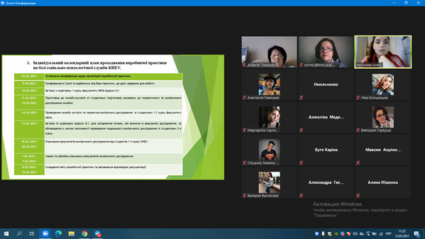 З 1 по 26 лютого 2021 на базі Соціально-психологічної служби КНЕУ проходили виробничу практику 5 студентів спеціальності 053 «Психологія» факультету управління персоналом, соціології та психології. За час практики майбутні психологи мали змогу ознайомитися з основними напрямками роботи служби та випробувати себе у практичній діяльності як дослідники, як просвітники з певної психологічної теми та як практичні психологи.