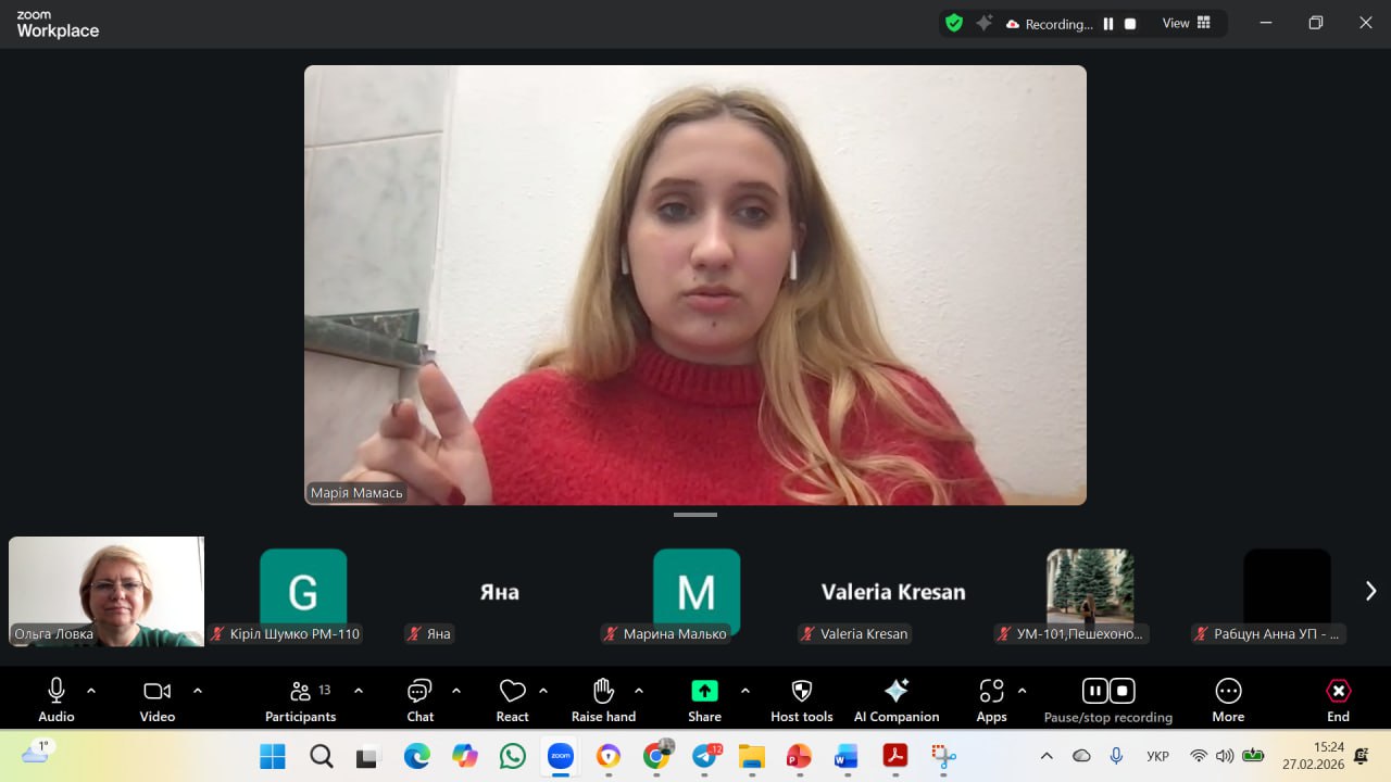 Службою соціальної адаптації та психологічної допомоги 27 лютого 2026 року  проведено вебінар на тему: "Тільки навчання, чи навчання і праця? Як і коли починати студенту професійну діяльність" для студентів 1 курсу.